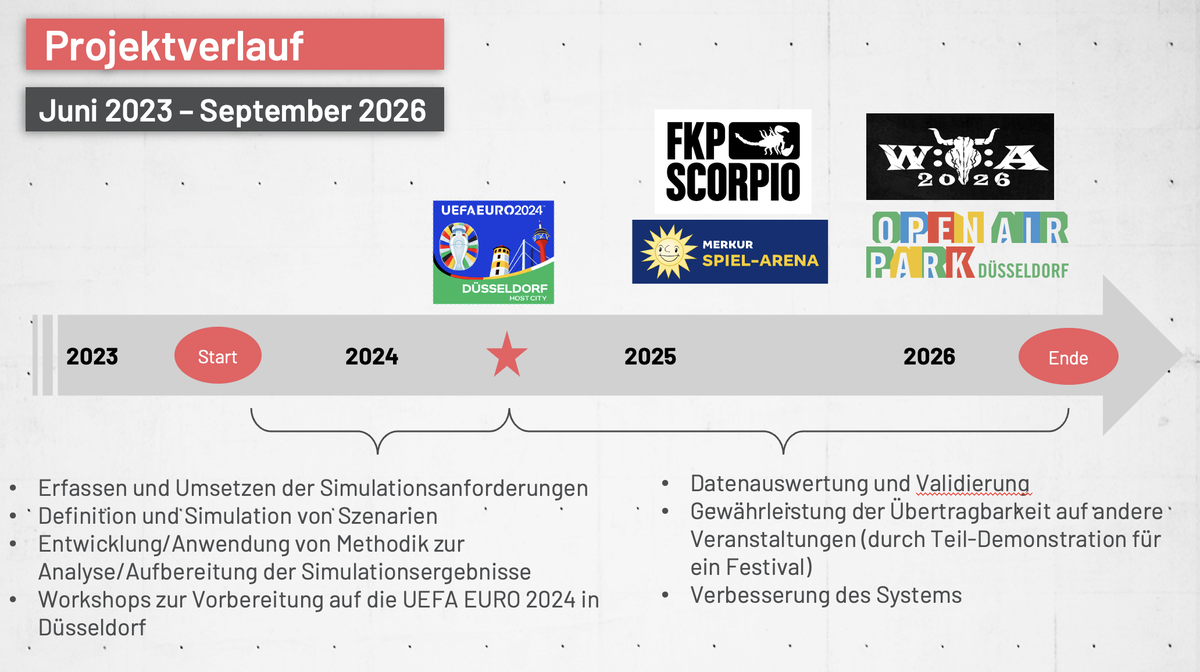 Das zu entwickelnde System richtet sich u.a. an Veranstaltungsplaner, Betreiber von Veranstaltungsstätten, BOS und Genehmigungsbehörden. Die Lösung wird für die UEFA EURO 2024 in der Arena Düsseldorf erprobt und soll später auch auf andere Veranstaltungsarten wie Festivals übertragbar sein.